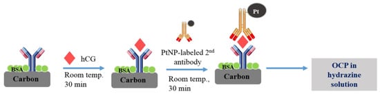 A scheme illustrating the principle of the PtNPs-based OCP immunoassay on the SPCE is shown in Figure 1. Different concentrations of the hCG antigen solution were made by diluting the stock solution in PBS containing 1% BSA for detection. These sample solutions were introduced to the Mab-FSH-immobilized working electrode of SPCEs for 30 min at room temperature. After rinsing with PBS, 2.0 μL of Pt-Mab-hCG solution was applied to the surface and incubated for 30 min at room temperature. Finally, the SPCEs were rinsed carefully with PBS.