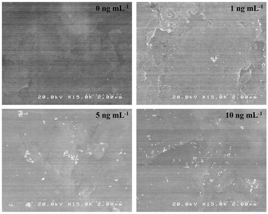SEM images of the electrode surface of PtNP-labeled immunocomplexes immobilized on SPCE surface at the concentration of 0, 1, 5, and 10 ng mL−1 of hCG.