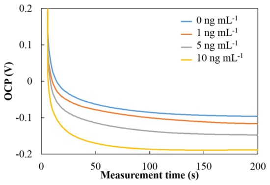 These types of sensors, however, still have some drawbacks. One of them is that they are not easily used for multiple detection, which is sometimes required for clinical application. For multiplex detection by the electrochemical method, multiple working electrodes system can be considered. In such a system, interference between working electrodes becomes a big problem. To solve this problem, one of the ways is just to repeat the voltammetry for each working electrodes one by one, but it consumes long measurement time. Another drawback is that the amperometric and voltammetric methods require voltage supply source to apply and to scan the potential in a complicated manner. In this regard, open circuit potential (OCP) appears to be an attractive detection principle for the development of simple biosensors [,,].