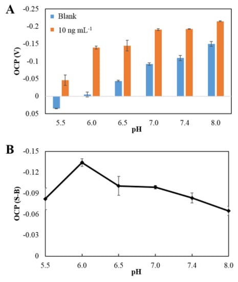 (A) The effect of pH of 50 mM PBS on the OCP signal of the blank (0 ng mL−1 of hCG: blue) and 10 ng mL−1 of hCG (orange); and (B) the plot of pH against OCP signal after background subtraction in 1 mM hydrazine solution.