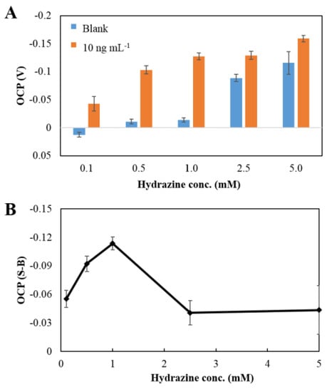 The pH of the medium solution of PBS and the concentration of hydrazine were studied because these factors can have an effect on the analytical detection results. These data were plotted as a function of the studied parameters. Next, the net OCP signal, after background subtraction, was measured, and the signal-to-blank difference (S-B) was plotted with respect to the studied parameters.