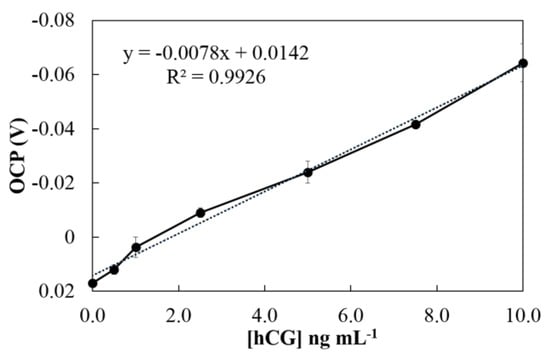 hCG was detected under optimal conditions using our proposed OCP system. A calibration curve was constructed by plotting the OCP signal versus known concentrations of hCG. Linearity was observed between 0 and 10 ng mL−1, with correlation coefficient (R2) higher than 0.99 (Figure 8). The LoD was calculated from 3 Sbl/S, where Sbl is the standard deviation of blank measurement (n = 10), and S is the sensitivity of the method (slope of linearity). The LoD was found to be 0.28 ng mL−1 (28 mIU mL−1), when the performance of the proposed electrochemical immunoassay was compared to the previous electrochemical immunoassay using voltammetry and amperometry for the detection of hCG [,,] as shown in Table 2. Although the previous techniques provided lower LoDs, the proposed system offers simpler electrochemical detection, a lower minimum amount of sample, and a more cost-effective disposable SPCE. To compare proposed sensor to the other hCG biosensors, such as lateral flow test strips colorimetric biosensor [,], our proposed sensor offers less amount of sample volume (as small as 2 μL), and ability to detect multi targets simultaneously with less interference. In addition, depending on the amount of hCG in pregnancy, marijuana use, hypogonadism (testicular failure), cirrhosis, inflammatory bowel disease, and duodenal ulcers, the obtained LoD is low enough to screen hCG concentration in clinical diagnostic applications []. The reproducibility of the proposed immunosensor was evaluated from the response to 10 ng mL−1 hCG at five independently prepared electrodes. The relative standard deviation (RSD) was 4.92%. Therefore, our proposed PtNP-based method demonstrates that it is a simpler electrochemical detection procedure with an acceptable sensitivity and reproducibility. Moreover, it could be applied to a simplified and miniaturized diagnostic system with minimal user manipulation.
