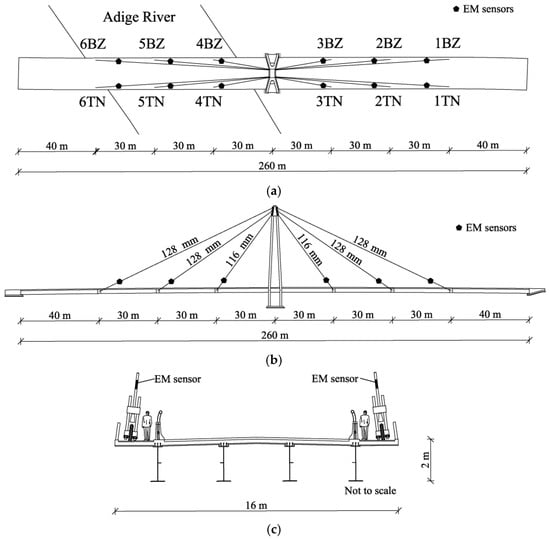 Adige Bridge: (a) plan view with sensor names (1TN–6TN, 1BZ–6BZ); (b) lateral view; (c) cross-section of the deck.