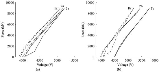 where Cn are coefficients independent of temperature to be derived from the calibration process. In order to determine these coefficients, as well as the parameters α and m, the sensor response was measured under different load and temperature conditions. The load calibration provided Cn and n, while temperature calibration provided α. During the load calibration, the cables, with the EM sensors attached, were connected to the tensing machine of Figure 3a, under constant temperature conditions. Then, the specimens were loaded and unloaded up to a force of 9000 kN, in steps of 1000 kN. After each load step, the sensor response was measured with at least three voltage readings (as suggested by the manufacturer) and compared to the force applied by the machine. Figure 3b shows that the temperature sensitivity of the permeability coefficient slightly depends on load. The permeability for the force of 7000 kN is an outlier and must be ignored. Figure 4a shows the relationship between the applied load F and the voltage V, for a cable of a diameter of 128 mm. Curves 3a and 2a are the responses of the first and second load cycles, at a temperature of 27.2 °C. It is clear that the relationship is not necessarily linear for every value of force. However, as long as the force is greater than 4000 kN, the relationship can be considered linear. Since the load applied to the cable of Adige Bridge is above 4000 kN, a linear equation was adopted for the force estimation. Moreover, the laboratory calibration showed that that the relationship curves obtained during several load cycles become more similar after the second cycle.