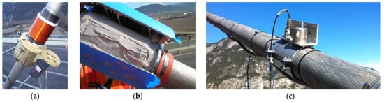 (a) Primary and secondary coil of EM sensors are wound around cables; (b) the two coils are protected by epoxy covers; (c) installation of accelerometers for in situ calibration.