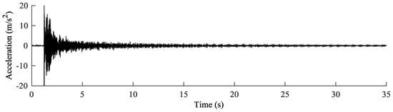 The in situ calibration was carried out without unloading the stay cables. The goal of this calibration was to define, for each cable, the offset F0 that the laboratory calibration showed to be dependent on the installation process. In order to estimate the reference loads of the cables of Adige Bridge without releasing the cables, vibration tests were performed. Two different accelerometers were applied near each other on each cable (Figure 5c). The connection was made by fastening a steel shell on the cable. Then, the accelerometers were glued to an aluminum plate, and the plate bearing the accelerometers was later screwed to the shell. The whole system was considered perfectly rigid. The test was carried out for each cable by recording its response to a hammer blow with a rate of 500 Hz. Figure 6 shows as an example the response of cable 1TN (Figure 1a). Next, frequency spectrums were obtained by implementing a fast Fourier transform (FFT). The frequency spectrum of cable 1TN is shown in Figure 7a. Despite the peak frequencies being clearly visible in the graphs obtained through the FFT, the natural frequencies were calculated by fitting the spectrums (Figure 7b) with the theoretical expression: