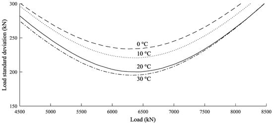 Experimentally, it has been found that the estimated loads have limited accuracy even when many harmonics are identified: the standard deviation of the baseline cable tension was 200–300 kN for cable tension varying from 4000 kN to 7000 kN. Furthermore, due to uncertainties in the coefficients a and b, the accuracy deteriorates when the conditions are different from those of calibration. Figure 8 shows the expected standard deviation for different values of tension and temperature simulated using Monte Carlo analysis [27]. The graph shows that the most significant source of error is the inaccuracy of the baseline measurement. Compared to this, the uncertainty in force sensitivity is not critical, while the temperature sensitivity can result in an additional error of 50 kN. Similar results were found for all the cables of Adige Bridge.