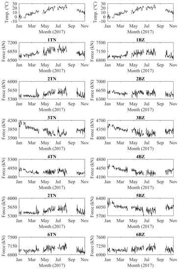 The in situ calibration of the force in each cable enabled the continuous acquisition of data from the monitoring system. The values of temperature and force acquired since 1January 2017 are shown in Figure 9. The effect of temperature on the sensors was removed from the data of Figure 9, while the effect of temperature on the structure was not. The figure shows, for each cable, one value per day, recorded in the early morning, at about 6:00 a.m. At this time, the temperature of the whole structure is approximately homogenous. However, the average daily temperature changes during the year. Since the structure is statically indeterminate, we expected different temperature effects on different cables due to load redistribution. Figure 9 proves that the force in the cables is severely affected by the temperature variations. The monitoring data show that the force of the cables anchored near the bridge shoulders (1TN, 1BZ, 6TN and 6BZ) increases with temperature, while the force of the cables anchored near the tower (3TN, 3BZ, 4TN and 4BZ) decreases with temperature. The explanation of this phenomenon is beyond the scope of this paper and will be made in future work. Nevertheless, the force recorded from the stay cables was compatible with the behavior predicted during the design of the structure and was in the range of the force obtained from vibration tests, which confirms the reliability of EM sensors.