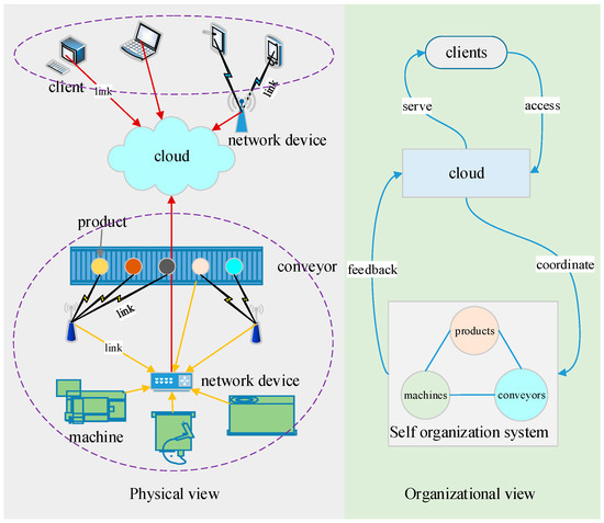 From a hardware point of view, machines (e.g., CNC machine tools), conveyors (e.g., conveyor belts, AGVs, and robotic arms), products (e.g., raw materials, parts, and components), cloud (public or private, providing virtual machines), client terminals (e.g., computers and smart cell phones), and network (general/industrial networks in the wired/wireless form) are directly related to production.