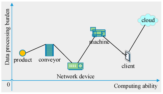 Figure 2, the cloud, client terminals, and network devices are computer-like equipment so as to be able to compute and store data. The machines, conveyors, products are also armed with computerized controllers. Therefore, all these components have some computing ability and storage capacity. The cloud has the most powerful computing resource to accommodate data and software; the client terminals are mainly used to display graphs or GUIs, and little analysis needs doing in the terminals; network devices are for communication, so that user reprograming is not needed. While the products do not need to be controlled by physical actions, the conveyors need simple control and the machines need complex control. Therefore, the machines and the cloud are two main components responsible for the industrial data analysis.