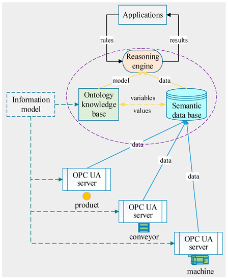 Figure 3 describes a combination of ontology-based knowledge modeling, OPC UA-based sematic data generation, and semantic data base to implement real-time processing of industrial data. Information models for machines, conveyors, products, and the system should have been built previously. Based on the information model, the concepts in the domain and also the relationships that hold between those concepts can be defined with a software tool, like Protégé, to create an ontology model. According to the same information model, OPC UA address spaces are created for the machines, conveyors, and products, and the ontology is created for the system.