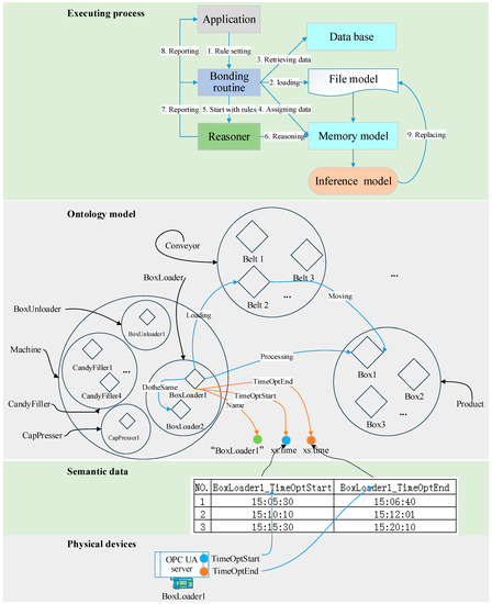 It is easy to see that the values for TimeOptStart, and TimeOptEnd cannot be determined in advance. They should be acquired from the shop floor production process. The BoxLoader1 in the psychical layer is responsible for recording these values into its OPC UA address space and sending them to the semantic data base that bridges the gap between the physical machines and the ontology model. This is because the properties of the ontology model correspond to the database fields, which in turn correspond to the OPC UA variables (
