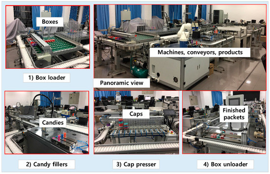 Figure 6). There are three machines used to upload the boxes onto the conveyor belts, to cover the lids after all the candies required are put into the box, and to download the boxes off the conveyor belts after the lid covering operation. A RFID tag is attached on the surface of each box to store consumer customization information, i.e., the candy types and the number of candies of each type. In addition, during the locomotion of the box, it negotiates with candy loading machines and conveyor belts to determine machines and construct transportation routes. In the UniqueCandy benchmarking, five conveyor belts are deployed to build four intersecting loops featuring multiple branches. Four robotic arms are used as candy loading machines responsible for different candy types.