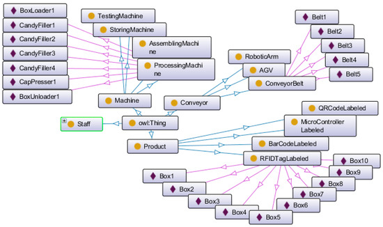Figure 4. With Protégé, we define three Classes called Product, Machine, and Conveyor. Each class has several individuals, i.e., instances or objects used by other technologies. For an individual, two types of properties can be defined, an object property linking the individuals (e.g., the property loading linking two individuals—BoxLoader1 to Belt2), and a datatype property actually defining variables for an individual [