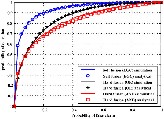Figure 2 shows the global probability of detection versus the global probability of false alarm of the hard OR and AND fusion rules and the soft (EGC) fusion rule. The detection performances of these rules were evaluated. Ten thousand independent Monte Carlo simulation trials verified the theoretical results. Assume that all nodes have an SNR of −12 dB, the number of cooperative SUs M is 6, and the samples N is 400. We observed that the soft fusion rule achieved a higher detection probability than either of the hard fusion rules, and that the detection probability of the hard OR rule outperformed AND rule. Meanwhile, the theoretical results are well matched with the simulation results.