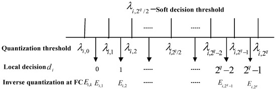 In Equation (15), represents the quantization process at SU i, and denotes a binary codeword. and denote the (k − 1)-th and k-th quantization boundaries at SU i, respectively. Figure 3 shows the proposed q-bit quantizer.