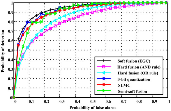 Receiver operating characteristics (ROC) curves of the proposed 3-bit quantization fusion scheme in comparison to the soft fusion (EGC), hard fusion (AND), hard fusion (OR), SLMC fusion, and semi-soft fusion schemes.