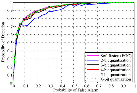 Figure 4 presents the ROC curves of the proposed multibit quantization detector with the hard OR and AND fusion rules, the soft fusion (EGC) rule, the SLMC fusion scheme, and the semi-soft fusion scheme. The detection probability of the 3-bit quantization-based soft fusion rule outperforms the SLMC fusion rule, the semi-soft fusion rule, and the hard fusion rules. Meanwhile, compared to the soft (EGC) fusion rule, the performance loss of the proposed scheme is negligible. To further evaluate the effect number of quantization bits on detection performance, the results in terms of the probability of detection for different quantization bits are given in Figure 5. We also found that the performance gain saturates when quantization bits are greater than 4. In particular, the detection performance of 4-, 5- or 6-bit quantization-based soft fusion rules is comparable to the soft fusion (EGC) rule without quantization. However, in practice, the number of quantization bits selected depends on the tradeoff between the available resource and the system’s required performance. For instance, the 2-bit and 3-bit quantization detector achieves a probability of detection of about 0.7 and 0.8 with less cooperative overhead, respectively, when the probability of false alarm is fixed at 0.1.