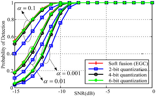 We also verify the performance of the proposed quantization-based multibit soft fusion scheme with different values of quantization bits q and different values for global probability of false alarm , where we opt q = 2, 4, 6, and = 0.1, 0.01, 0.001. From Figure 6, it can be observed that 4-bit and 6-bit quantization-based soft fusion rules achieve comparable detection performance for each value of , but outperform those achieved by 2-bit quantization-based soft fusion. Furthermore, for a given SNR that is less than −8 dB, the probability of detection is improved by increasing the probability of false alarm and the number of quantization bits.