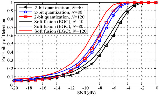 In general, increasing the samples of the received signal improves the spectrum sensing detector’s performance. Unfortunately, increasing the sensing interval will increase delay in spectrum sensing and lead to a loss in opportunities for spectrum access. Figure 7 shows the detection probability versus the SNR under various numbers of samples for the proposed 2-bit quantization fusion rule. Figure 7 shows that the detection probability is improved when the number of samples increases from 40 to 80 and from 80 to 120. It is also clear that this is true for the soft (EGC) fusion rule. For instance, given SNR = −6 dB, M = 4, and Qf = 0.05, if the required detection probability is 0.8, we can select an N of at least 80.