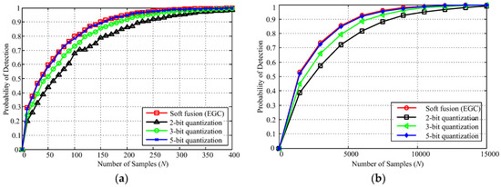 Figure 8a,b illustrate the detection probability with the number of samples varying from 0 to 400 for an SNR of −8 dB and from 0 to 15,000 for an SNR of −16 dB, respectively. Simulation results in Figure 8 shows that the 5-bit quantization-based soft fusion rule achieves a performance comparable to the soft (EGC) fusion rule with various numbers of samples. For a fixed N, increasing quantization bits q of each cooperative SU can enhance the probability of detection. We also found that the performance gain of the proposed fusion rule is relatively higher between quantization bits q = 2 and 3 than the quantization bits q = 3 and 5, respectively. For example, if the required detection probability is more than 0.9, based on Figure 8, we can determine the required number of samples to meet the desired detection probability under SNR = −8 and −16 dB, respectively. In order to meet the detection probability Qd = 0.9, for −8 dB, the proposed quantization fusion rule requires the number of samples to be approximately 230, 200, and 150 with quantization bits q = 2, 3, and 5, respectively. Similarly, for −16 dB, quantization bits q = 2, 3, and 5 require the number of samples to be about 7600, 6000, and 5200, respectively. Therefore, at low SNR conditions, more bits and a large number of samples are required to further improve detection performance.