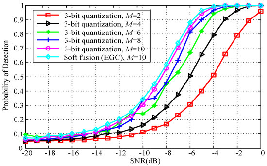 To further evaluate the detection performance of the proposed fusion rule, Figure 9 shows the probability of detection versus the SNR for various M with 3-bit quantization. It is shown that the detection probability increases by increasing the number of cooperative SUs. It is also clear that, when SNR is greater than −10 dB, the probability of the detection gain is high between M = 2, M = 4, and M = 6 cases of the proposed fusion rule. However, the detection probability gain is relatively low between the M = 8 and M = 10 cases of the proposed fusion rule. For instance, if we require a detection probability Qd of 0.8 at an SNR of −6 dB, the required number of cooperative SUs is no less than 8 for 3-bit quantization.