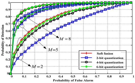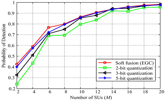 The sensing performance with a different number of cooperative SUs, M, is shown in Figure 11 for quantization bits q = 2, 4, and 6. When the number of cooperative SUs is relatively high, the performance gain improves slightly by increasing the quantization bits q. Hence, diversity information among different cooperative SUs further improves detection performance.