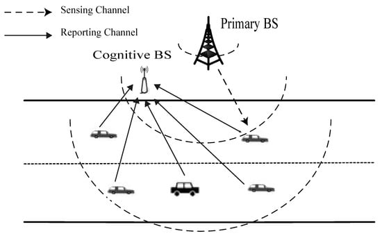 To solve the aforementioned problems, cognitive radio (CR) [1,2] has increasingly been presented as a potential technique being capable of accessing licensed but unoccupied frequency bands only without causing any unacceptable interference to licensed users (or primary users, PUs). Cognitive radio has become one of the most breathtaking technologies to improve the spectrum efficiency effectively for the past couple of decades. In addition to a better remedy for frequency scarcity issue, cognitive radio is appropriate for vehicular environments, since their unique characteristics make it much better to achieve the spatial and temporal reusage of the empty frequency bands of PUs compared to other traditional cognitive networks [3,4]. To efficiently reutilize the spectrum holes with minimum interference to PUs, the CR-enabled vehicles, which can be called secondary vehicular users (SVUs), need to reliably make a decision inferring the presence or absence of the PU. Consequently, spectrum sensing constitutes the key component of cognitive vehicular networks (CVNs) [5].