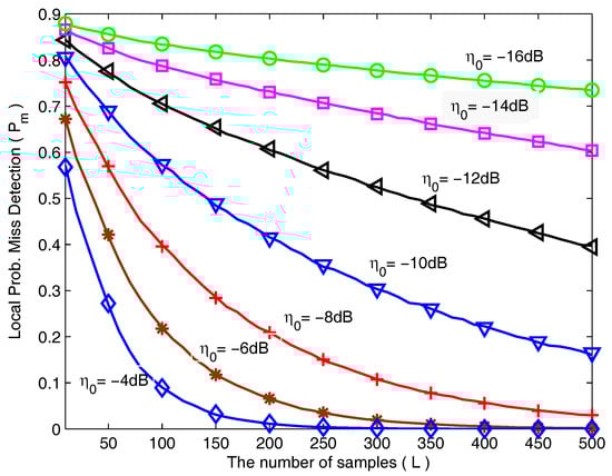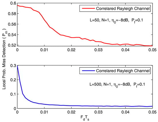 In Figure 4, the local is shown as a function of Doppler shift . The simulation parameters are L = 50/500, N = 1, = −8 dB and = 0.1. With the carrier frequency and the sampling interval fixed, value varies at a rate linearly proportional to the speed of the SVU. In addition, a larger results in a smaller correlation coefficient (). The results show clearly that, the probability of misdetection is a decreasing function of the speed of the SVU for all the system configurations. In addition, the local with 500 samples declines drastically compared with 50 samples. This reason is that high mobility and a greater number of samples give us an opportunity to achieve more received signal information, thereby enables SVUs to obtain higher sensing performance.
