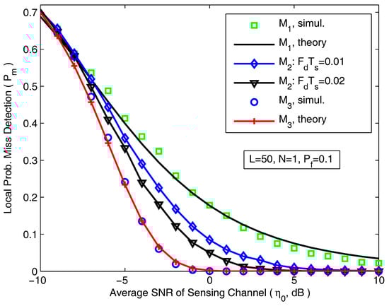 In this section, both theoretical and simulated results are provided through numerical and Monte Carlo simulations to illustrate spectrum sensing performance in cognitive vehicular networks. We run the Monte Carlo simulation results over independent trials to verify the accuracy of the developed analytical results. Note that the arbitrary parameters, L, N, and are fit for the developed analytical results of the local (global) probability of misdetection. Therefore, for all simulation cases, we choose some simple parameters, L, N, and to plot the local (global) probability of misdetection, and observe how they affect the system sensing performance.