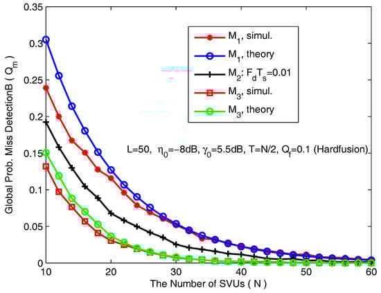 Secondly, we turn to cooperative scenarios. In Figure 6, we plot the global probability of misdetection () as a function of the number of SVUs for hard fusion based on counting rule. The simulation parameters are L = 50, = −8 dB, = 5.5 dB, and = 0.1. As expected, the global misdetection probability decreases along with the increase of the number of SVUs. When N is extremely big, the global mis-detection probability approaches 0. For hard fusion, Figure 6 clearly demonstrates that the derived probability of misdetection based on Lindberg-Feller approximation is relatively poorer for a smaller number of SVUs. However, along with an increasing number of SVUs, the approximation asymptotically grows closer and closer to the exact sensing performance.