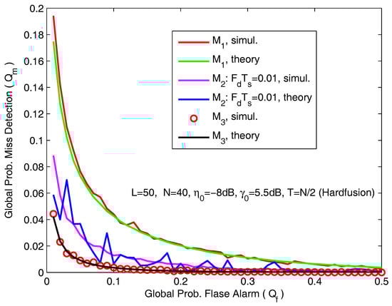 In Figure 7, we present the ROC curves for different channel models. The simulation parameters are L = 50, N = 40, = −8 dB and . Note that, in the case of and , we obtain the average misdetection probability for local sensing, allowing for a much smoother global probability curve than the case of .