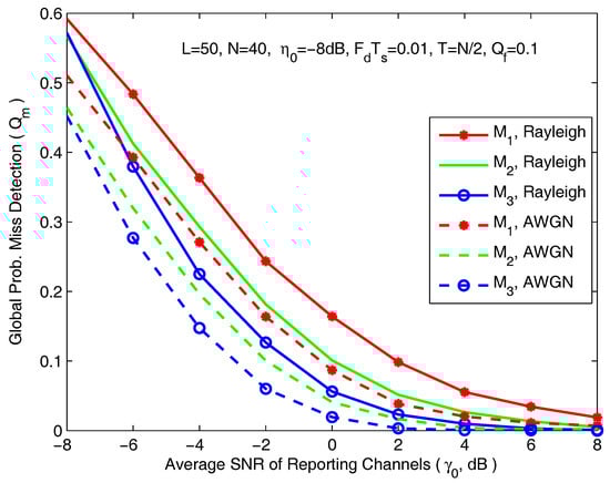 The global probability of misdetection as a function of average SNR of reporting channels.