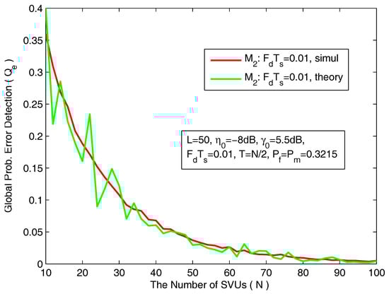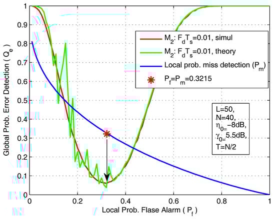 In Figure 9, we plot the global probability of error detection () as a function of the local false-alarm probability. The simulation parameters are L = 50, N = 40, = −8 dB, = 5.5 dB, = 0.01 and . We can clearly see that, under certain conditions, there is an minimum probability of error detection, and that can be achieved when the local probabilities of false-alarm and mis-detection are equal ( ). In Figure 10, we plot the minimum achievable probability of error detection () as a function of the number of SVUs.