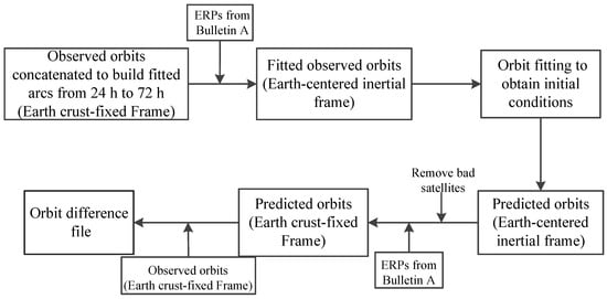 where M is an orbital frame scale factor, is a translational vector with respect to the orbital origin, and is a rotational vector with respect to each coordinate axis. The stability of these Helmert transformation parameters was used as an additional indication of the orbit prediction performance. The Position and Navigation Data Analyst (PANDA) software developed by GNSS research center of Wuhan University in China [17] was used for all the data processing of the orbit predictions in our study. The workflow is shown in Figure 1.