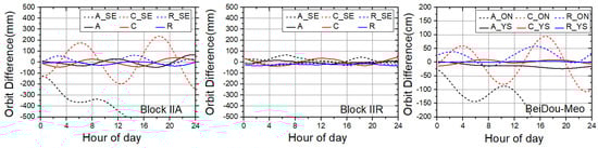 It is necessary to point out that GPS Block-IIA, BeiDou-IGSO and -MEO satellites cause special modeling problems. During eclipse seasons, GPS Block-IIA satellites perform shadow and post-shadow yaw maneuvers. Thus Block-IIA satellites show a lower performance during eclipses than Block-IIR satellites, for which the yaw attitude is simple to model and predict (very close to nominal yaw-steering (YS) attitude in most case) [36]. BeiDou-IGSO and -MEO satellites adopted the attitude mode of switching between YS and orbit-normal (ON) modes [37]. The yaw attitude switches from the YS mode to the ON mode, and vice versa, when the latitude of the satellite equals 90° and the elevation angle of the sun above the orbital plane is close to 4° [38]. During the ON mode period, significant accuracy degradation of predicted orbits has been shown in our study.