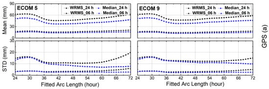 The means and standard deviations (STDs) of weighted root-mean-square (WRMS) and median residuals for orbit differences between predicted orbits and precise ephemerides after Helmert frame transformation over the first 6 h and full 24 h intervals for GPS. Results for reduced Empirical Center for Orbit Determination in Europe Orbit Model (ECOM-5) are shown on the left and for nine-parameter (ECOM-9) on the right planes.