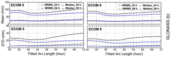 For other GNSSs, the arc lengths that showed the smallest WRMS and median values fell between 40 and 45 h for GLONASS, and between 42 and 48 h for Galileo (Figure 5 and Figure 6, respectively). The WRMS and median values during the above-selected arc length intervals showed very small differences for each navigation system. We can also see that the means and STDs of the WRMS and median for BeiDou-IGSO/MEO were quite flat after 42 h, particularly for BeiDou-IGSO (Figure 7). In addition, the curves of Galileo and BeiDou dropped sharply between 24 and 36 h of fitting the arc length. The reason could be that the orbit dynamic models, especially solar radiation pressure model of Galileo and BeiDou are not accurate enough compared to those of GPS and GLONASS.