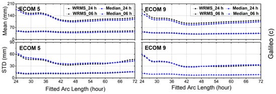 The means and STDs of WRMS and median residuals in the selected fitted arc lengths for the four navigation satellite systems are shown in Table 3. As can be seen from Table 3, the WRMS and median of Galileo and BeiDou were around 10 cm for 24 h predictions, which were much larger than those of GPS and GLONASS, that is, because of the poorer accuracy of the observed orbits and the imperfect orbit model.