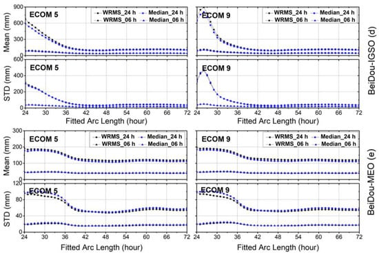 Compared with ECOM-9, the STD curves of ECOM-5 varied strongly with the arc length for 24 h predicted solutions of GPS, GLONASS and Galileo, while the curves of ECOM-5 and ECOM-9 showed similar trends for BeiDou-MEO. As for BeiDou-IGSO (Figure 7), the curves of ECOM-9 have cusps between 24 and 28 h for the 24 h predicted solutions, and the reason for this needs to be studied further.