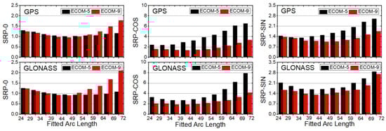 As can be seen from Figure 8, the trends of SRP parameters for GPS were similar to those for GLONASS. The RMS values of daily variations showed similar “U”-shape patterns for different SRP parameters. For GPS, the arc lengths for ECOM-5 that showed the smallest RMS values fell in the 44–48, 29–33, and 34–38 h fitted intervals for the constant, cosine and sine terms, respectively, but the arc lengths fell between 44 and 48 h for all three SRP terms for ECOM-9. For GLONASS, the RMS values achieved a minimum in the 39–48 h fitted intervals for all three terms for both ECOM-5 and ECOM-9. In addition, for the cosine and sine terms, RMS values of ECOM-9 were smaller than those of ECOM-5 for GPS and GLONASS. For the constant term, the difference between ECOM-5 and ECOM-9 was very small before 48 h, but RMS values of ECOM-9 had stronger variation after 48 h.