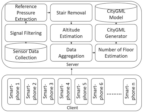 In this section, we present the main components of our approach. As visualized in Figure 1, the approach is composed of the Sensor Data Collection module, which collects the data from smartphone users via an application that has been developed for the purpose of this research and can be found in ref. [19]. After smartphone pressure sensor data are collected, noise is filtered out in the Signal Filtering module. The Reference Pressure Extraction module has two roles: (1) to filter outdoor data, and (2) to identify locations where pressure readings can be extracted. In the Stair Removal module, features that belong to intermediate heights (i.e., stairs or elevators) are rejected. Remaining pressure readings are later used in the barometric formula for Altitude Estimation. In the Data Aggregation module, we combine data from multiple users, while the Floor Estimation module has two roles: (1) to identify the number of floors in a set, and (2) to estimate the altitude of each floor. Finally, in the CityGML Generator module, a CityGML Model is dynamically generated.