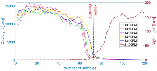 Light data from six outdoor–indoor transitions (OITransitions) collected during the same day, five during day time and one during night. As can be seen, during the OITransition (after the 70th sample), the light intensity rapidly decreases during the day (left axis) and increases during the night (right axis).