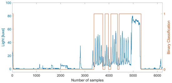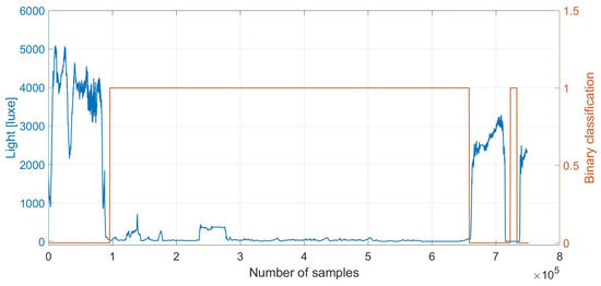 Outdoor–indoor transition (OITransition) classification using light. The binary flag of 1 (orange line and right axis) indicates indoor area. We note that during the period after sample , the smartphone was in a pocket. However, it is wrongly classified as indoors. This demonstrates the need for fusion with the proximity sensor, which can indicate whether the phone is exposed (the light sensor can be trusted) or not.