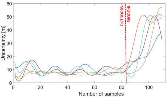GPS uncertainty data from five outdoor–indoor transitions (OITransitions). As can be seen, at the moment of the transition after the 100th sample, the uncertainty rapidly increased.