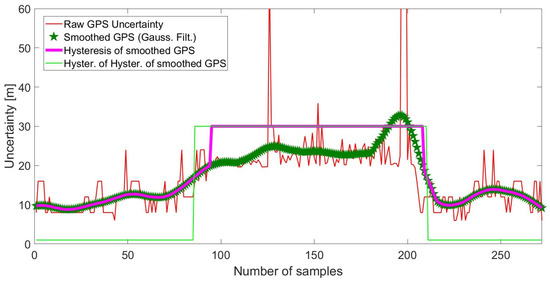 Another characteristic of the OITransition is the rapid increase of the GPS uncertainty. As a result, in our approach, we recorded the GPS uncertainty with a sampling frequency of proximately 1 Hz. As can be seen in Figure 5, at the moment of the transition (after the 80th sample), the GPS uncertainty increased from less than 10 m to almost 60 m. Hysteresis thresholding [23] was applied for the maximization of the margin between low GPS accuracy (indoors) and high-accuracy data (outdoors) for better classification. More specifically, GPS uncertainty was first smoothed via a Gaussian smoothing filter. Then multiple hysteresis thresholding was applied in order to enhance the margin and hence the accuracy of the OITransition classification. The approach can be seen in Figure 6. As can be seen in the figure, raw GPS uncertainty (red line) was first smoothed with a Gaussian filter. Then hysteresis thresholding was applied to the smoothed signal (magenta line).