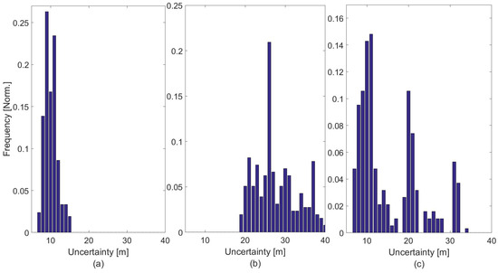 On the other side, as can be seen in Figure 7a,b, the histograms show a more symmetric pattern, which is an indication that the data are extracted from a single place; this place is either indoors or outdoors. More specifically, as can be seen in Figure 7b, the GPS uncertainty is high—more than 20 m—which is an indication that the particular segment has been extracted from exclusively indoor locations. On the other side, as can be seen in Figure 7a, the GPS scores a low uncertainty—less than 15 m—which is an indication that the data are extracted from exclusively outdoor locations.