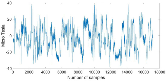 The magnetic sensor can detect disturbances of the ambient magnetic field, as a result of steel elements inside the walls of a building. Hence, the intensity of the magnetic field can be used as an indicator for identifying the OITransition [24]. In this section, we introduce a process for the identification of the OITransition by measuring the disturbances of the magnetic field. For the identification of OITransitions, we combine a Gaussian filter and the moving window standard deviation. In the following example, we selected a magnetic dataset from the collected data [20] from four of our buildings. The corresponding magnetic signal is shown in Figure 8: