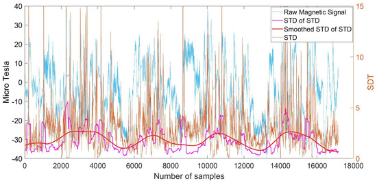 In the first step, disturbances in the signal were found using the moving window standard deviation with a window size of 20 samples along the time axis. The resulting signal is shown in Figure 9 (orange line). Once disturbances were identified, a second moving standard deviation extraction was applied to the new generated signal. This time, the window size corresponded to 200 samples. The result is illustrated in Figure 9 (purple line).