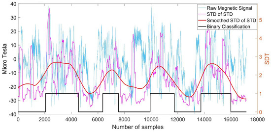 Magnetometer signal from walking into four consecutive buildings and corresponding smoothed moving STD of the disturbance, with kernel size of 200 samples, and the final binary classification.